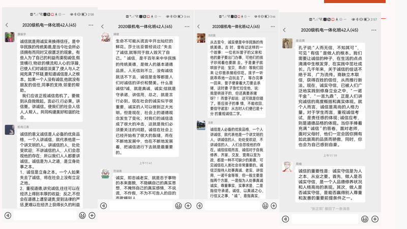 在群聊討論環(huán)節(jié),同學(xué)們結(jié)合當(dāng)前的誠信現(xiàn)象踴躍發(fā)言。喬羿楓同學(xué)說,我國優(yōu)秀文化傳統(tǒng)不斷提醒人們應(yīng)該怎么做,不應(yīng)該怎么做。薛振宇同學(xué)說,如果一個(gè)人沒有誠信,他就沒有朋友的信任,同事的支持,鄰里的幫助。楊學(xué)勇同學(xué)說,如果沒有了誠信,人們也就不會(huì)互相合作。董道利說,誠信不是一句口號(hào),不是一個(gè)噱頭,而在于生活工作的時(shí)時(shí)處處,在于點(diǎn)點(diǎn)滴滴的每一件小事、每個(gè)細(xì)節(jié)。周榆同學(xué)說,做人是否誠信,是一個(gè)人品德修養(yǎng)狀況和人格高尚的表現(xiàn)。張正陽同學(xué)說,大學(xué)生應(yīng)該具備固守誠信講信用,守諾言的優(yōu)秀品質(zhì)。金運(yùn)奧同學(xué)說,對(duì)于學(xué)生而言,重視誠信考試,是責(zé)任感的體現(xiàn)。