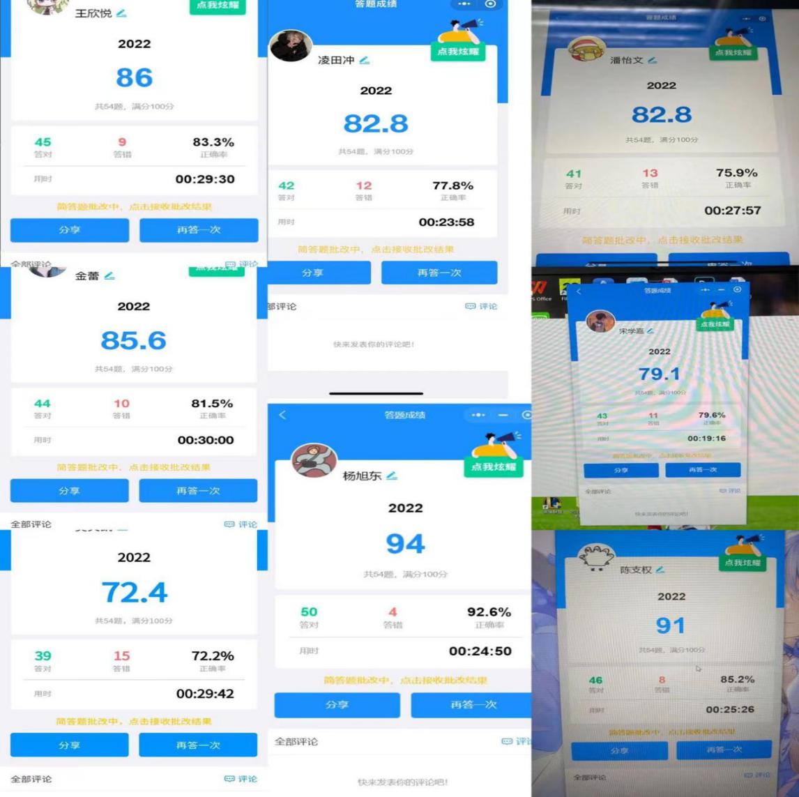 競(jìng)賽當(dāng)天上午10點(diǎn),負(fù)責(zé)人準(zhǔn)時(shí)下發(fā)競(jìng)賽小程序二維碼,同學(xué)們立即進(jìn)入小程序,仔細(xì)思考認(rèn)真答題。競(jìng)賽結(jié)束后,同學(xué)們積極交流本次活動(dòng)的想法和感受,并分享了本次競(jìng)賽的成績(jī)。秘書(shū)處統(tǒng)計(jì)參賽同學(xué)的成績(jī),給予參賽同學(xué)表?yè)P(yáng)與鼓勵(lì),并為本次競(jìng)賽前三名頒發(fā)榮譽(yù)獎(jiǎng)狀。