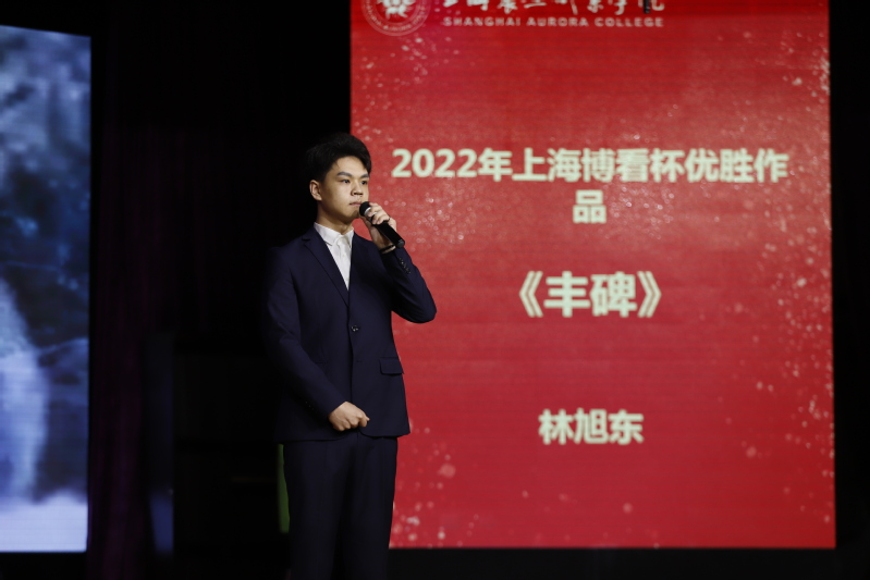 21戲劇影視表演1班林旭東帶來詩朗誦《豐碑》,該作品已進(jìn)入2022年上海市博看杯誦讀大賽決賽。盡管時(shí)光無情地飛逝,但我們都會牢記那些拋頭顱、灑熱血的日子,我們更會銘記那個(gè)扣人心弦、轟轟烈烈的年代。