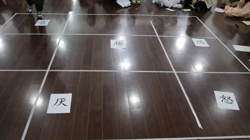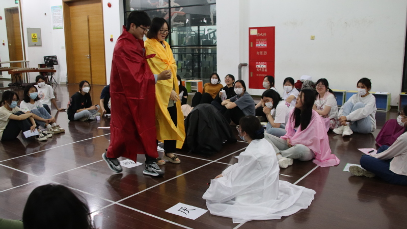 活動(dòng)的第二部分,由輔導(dǎo)老師選取一個(gè)在大學(xué)生活中比較常見(jiàn)的宿舍矛盾問(wèn)題為切入點(diǎn),讓一組同學(xué)進(jìn)入角色扮演,分別代表喜、怒、恐、哀、趣五種情緒狀態(tài),其他同學(xué)進(jìn)行觀察記錄。借助不同顏色代表不同情緒狀態(tài)的披風(fēng),參與角色扮演的同學(xué)自編自導(dǎo)自演,將宿舍矛盾產(chǎn)生的過(guò)程及每個(gè)同學(xué)的內(nèi)部心理活動(dòng)展示出來(lái)。